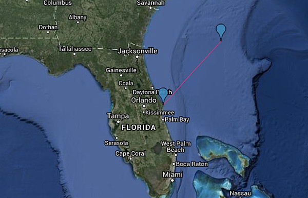 A rakétafokozat tervezett landolásának helye az Atlanti-óceánban, a starthelytől mintegy 300 km-re északkeletre. (Kép: Spaceflight Now)