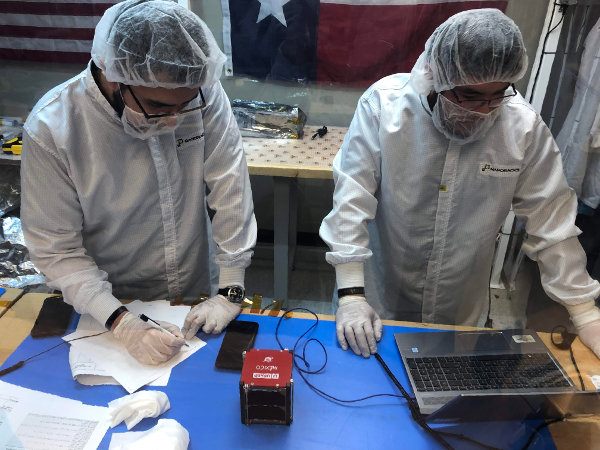 A rakományba becsomagoltak még öt CubeSat kategóriájú nanoműholdat, amelyek később kerülnek önálló pályára. A mexikói egyetemisták által épített és a képen látható AzTechSat-1 a műholdak közötti kommunikációval kapcsolatos kísérletre készült. Miután felkerül az ISS-re, a Kibo modulból állítják majd pályára. (Kép: NASA)