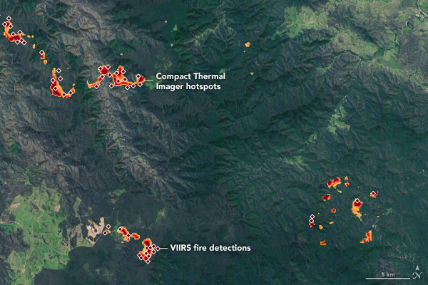Kiterjedt bozóttüzek 2019. november 1-jén az Ausztrália Új-Dél-Wales tartományában található Gondwana esőerdőben a CTI detektor mérései alapján. (Kép: NASA EO / Lauren Dauphin)