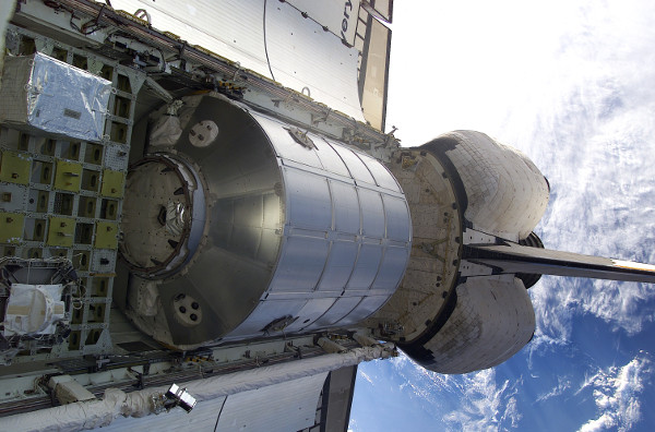 A Leonardo modul az ISS-hez csatlakozott űrrepülőgép rakterében, a 2001-es első látogatása alkalmával. Ez után a repülés után még hat alkalommal szállították fel és le, mígnem 2011-ben állandó űrállomásmodul vált belőle, PMM (Permanent Multipurpose Module) néven. (Kép: NASA)