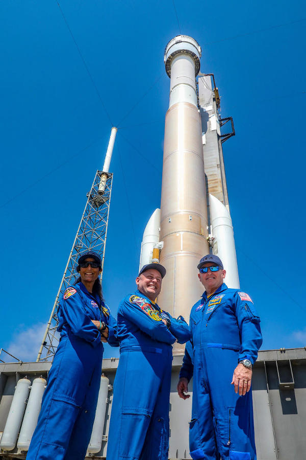Az Atlas-5 rakéta és a Starliner indítóállásra szállítását, valamint az egész repülést megkülönböztetett figyelemmel kíséri a majdani berepülést végző első személyzet, Sunita Williams, Michael Fincke és Barry Wilmore (balról jobbra), a NASA űrhajósai. (Kép: Boeing / John Grant)