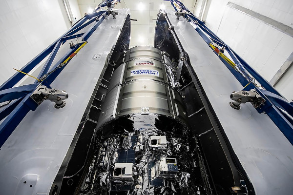 Az NG-20 előkészületei: először került Cygnus teherűrhajó egy Falcon-9 rakéta orrburkolata alá. (Kép: SpaceX)