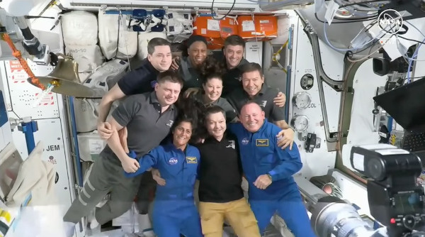 Csoportkép a megérkezés után. Elöl középen Oleg Kononyenko, az ISS jelenlegi 71. állandó személyzetének orosz parancsnoka (aki, mint az emberiség leghosszabb ideig repült űrhajósa, a napokban volt túl a világűrben összesen eltöltött 1000-edik napján). Balján Wilmore, a Starliner parancsnoka, jobbján Williams. A Starliner utasait fogadó hosszú távú személyzet további hat tagja a hátsó sorban balról jobbra Nyikolaj Csub, Jeanette Epps és Matthew Dominick, a középső sorban balról jobbra Alekszandr Grebjonkin, Tracy Dyson és Michael Barratt. (Kép: NASA)