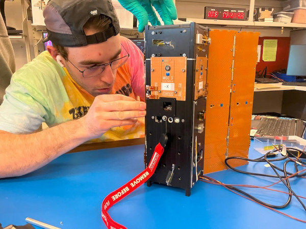A később önálló pályára kerülő négy CubeSat közül az egyik a képen látható, az Arizonai Állami Egyetemen épült DORA (Deployable Optical Receiver Aperture), amely egy optikai kommunikációs technológiai kísérlet. A másik amerikai nanoműhold az Iowai Állami Egyetem CySat-1 nevű űreszköze, amellyel a talaj nedvességtartalmára vonatkozó méréseket szeretnének végezni. Ezek a NASA támogatásával (Educational Launch of Nanosatellites – ELaNa program) jutnak el az űrbe. További három CubeSat, az EMMA nevű amatőrrádiós, valamint a SaganSat-0 és SAKURA nevű oktatási műholdak Japánban készültek. (Kép: Danny Jacobs / NASA)