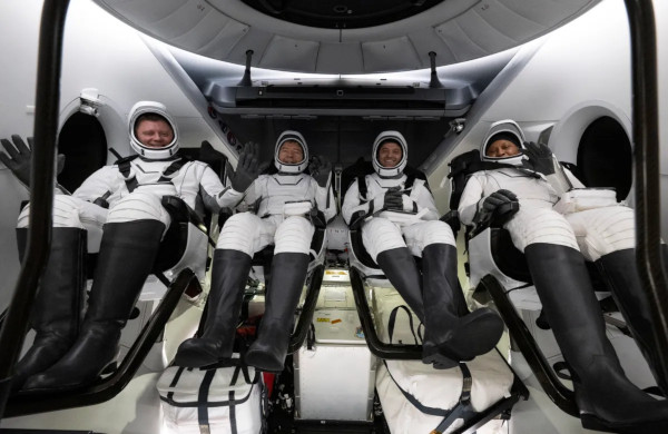 A több mint 7 hónap után, október 25-én a Nemzhetközi Űrállomásról (ISS) visszatért személyzet a Crew Dragon űrhajó kabinjában, a Mexikói-öböl vizére való visszaérkezést követően. Mindenki mosolyog – a képről nem derül ki, kit kellett utána kórházban tartani... Balról jobbra: Alekszandr Grebjonkin (Orordszország), Michael Barratt, Matthew Dominick és Jeanette Epps. (Kép: NASA / Joel Kowsky)