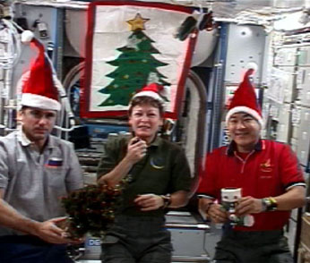 Az ISS 16. állandó személyzete ünnepi hangulatban. Balról jobbra: Jurij Malencsenko, Peggy Whitson, Daniel Tani. (Kép: NASA TV)