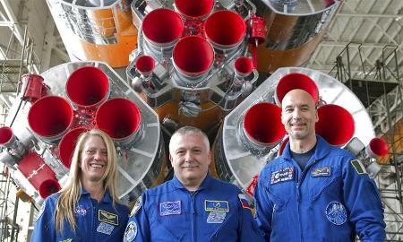 A Szojuz TMA-09M utasai, balról jobbra Karen Nyberg (NASA), az űrhajó orosz parancsnoka, Fjodor Jurcsihin, és Luca Parmitano (ESA / Olaszország), a Szojuz hordozórakéta előtt. (Kép: NASA)