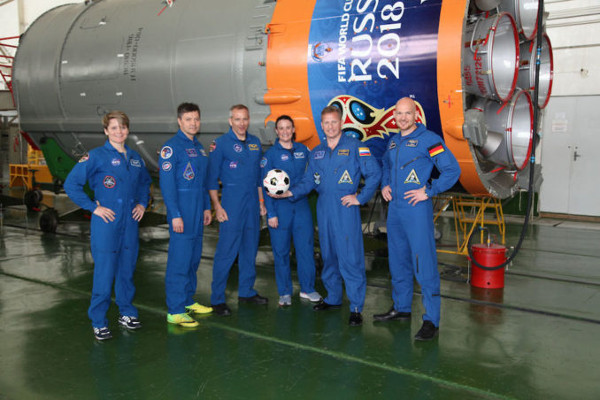 Csoportkép focilabdával és a rakéta feldíszített utolsó fokozatával. Balról jobbra a Szojuz MSZ-09 tartalék és tényleges személyzetének tagjai sorakoznak: Anne McClain, Oleg Kononyenko, David Saint-Jacques, Serena Auñón-Chancellor, Szergej Prokopjev, Alexander Gerst. (A nemrég viszatért Szojuz MSZ-07 személyzete egyébként egy labdát hozott vissza az ISS-ről, amelyet a világbajnokság moszkvai nyitómérkőzősén használnak majd.) (Kép: Andrej Seljepin / Gagarin Űrhajóskiképző Központ)