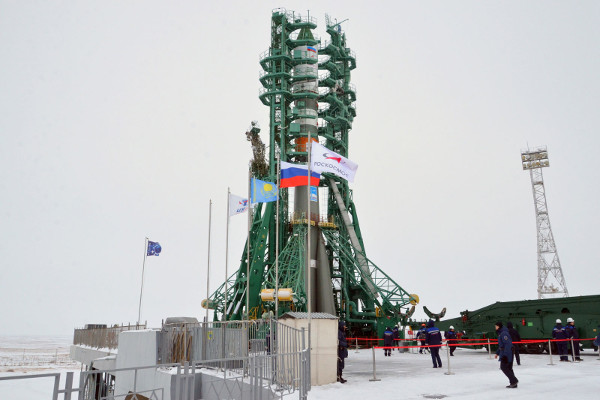 A Progressz MSZ-22 teherűrhajót pályára állító Szojuz-2.1a rakéta a start előtt, a bajkonuri 31/6 indítóállásban. (Kép: Enyergija)