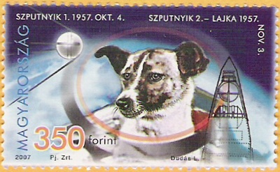 Az idei első magyar alkalmi postabélyeg Dudás László grafikusművész tervei alapján a Pénzjegynyomdában készült, 50 bélyeget tartalmazó ívekben, összesen 450 ezer példányban. Névértéke 350 Ft. A kiadás pontos neve: Űrkutatási évfordulók - 50 éve bocsátották fel az első mesterséges holdat és 50 éve járt az első élőlény a világűrben.