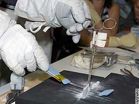 A fedélzeten is meglévő eszközök közül kettőből (fűrészlap és érszorító) a sebtében az irányítóközpontban kifejlesztett "célszerszámok" földi bemutatója. A csipesszel kéne megfogni, majd kihúzni a kitüremkedő anyagot, - illetve ha ez nem sikerülne, akkor azzal tartva, a fűrészlappal levágni.