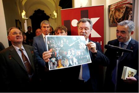 Farkas Bertalan Valerij Kubaszov (bal szélen) és Szergej Krikaljov kozmonautákkal (balról a második) még 2011. április 19-én, egy Budapesten, a Ruszisztikai Központban megnyílt Gagarin-emlékkiállításon.