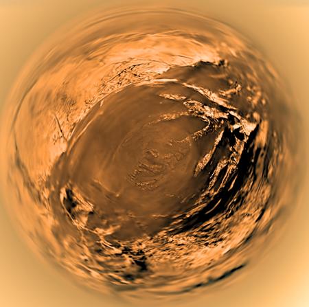 A Titan felszíne , ahogyan a Huygens leszállóhelye fölött 5 km-es magasságból lenne látható „halszemoptikával”. A képet a 2005. január 14-i leereszkedéskor készített felvételekből állították össze. (ESA/NASA/JPL/University of Arizona)