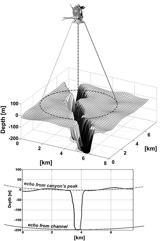 A kutatók a Titán felszínéről visszaverődő radarjelek segítségével becsülték meg a kanyon mélységét. Cikkük a Geophysical Research Letters folyóiratban jelent meg. (Kép: V. Poggiali et al.)