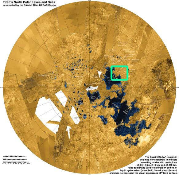 A Cassini felvételeiből összeállított mozaik a Titán északi pólusa vidékéről. A zöld keretben látható a Ligeia Marénak az a része, ahonnan a folyadékkal töltött kanyonok kiindulnak. (Kép: NASA / JPL-Caltech / ASI / USGS) Kapcsolódó cikkek: Kapcsolódó linkek: