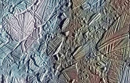 Az Europa felszínének részlete a Galileo-űrszonda felvételén. A felszín alatti folyékony vízre a magyarázat az árapályfűtés lehet. (Kép: NASA / JPL)