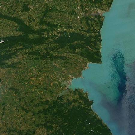 A felvétel nyugati felén látjuk Bulgária tengermelléki területeit, keleten a Fekete-tenger hullámait. Utóbbiak most nem szolgálnak rá a nevükre; a tenger parti zónájában hetek óta virágzik a fitoplankton, több száz kilométeres tengerrészt festve türkiz és zöldes színekre. A mikroszkopikus élőlények tömege a víz minőségét cseppet sem rontja, viszont gyönyörű színjátékot eredményez.