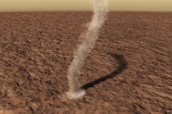 Porördög (portölcsér) a Marson a Mars Reconnaissance Orbiter felvételén. A porcsóva vastagsága több tíz méter lehet, a por több száz méter magasságig emelkedhet. (Kép: JPL / MSSS / NASA)