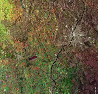 Budapest és környéke az ESA képgalériájából, az ERS-2 apertúraszintézis-radarjával (SAR) készült felvételek kombinációjából előállított képen (vörös: 2003. június 15., zöld: 2004. február 4., kék: 2003. szeptember 28.)