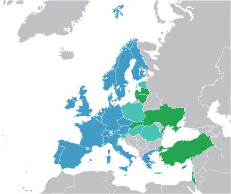 Az ESA jelenlegi teljes jogú tagállamait a térképen kék szín jelöli. Türkizzel az európai együttműködési programban (PECS) résztvevő államok (köztük hazánk), zölddel az ESA-val megállapodási szerződést kötött országok láthatók. Románia még az idén, a már aláírt csatlakozási szerződésük parlamenti ratifikációja után átkerül a kék színűek közé. Őket követik majd a lengyelek. (Kép: Wikimedia Commons)