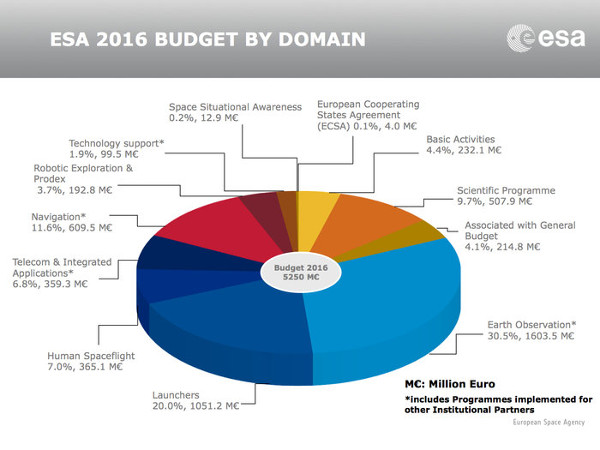 Az ESA 2016-os költségvetése a felhasználás fő területei szerint. (Kép: ESA)