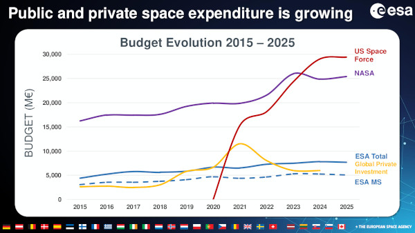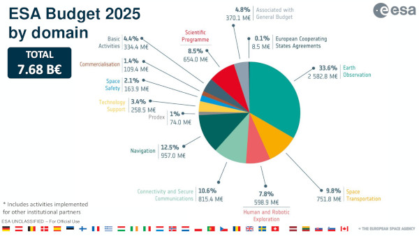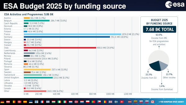 A január 9-ei tájékoztatón elhangzott, hogy az ESA 2025-ös költségvetése 7,68 milliárd euró, ami 1,4%-kal marad alatta a 2024-es 7,79 milliárdnak. A költségvetés mintegy kétharmada közvetlenül a tagállamok hozzájárulásaiból származik, a többi pedig az Európai Bizottságtól, az EUMETSAT szervezettől, továbbá egyéb közös programok keretében érkezik. A legnagyobb befizető tagállamok közül három, Németország, Olaszország és az Egyesült Királyság 2025-re számottevően csökkentette az ESA tevékenységéhez való hozzájárulását 2024-hez képest. A változásokat nemzeti politikai döntések vagy ezen országok befizetéseit használó programok ütemezése okozza.