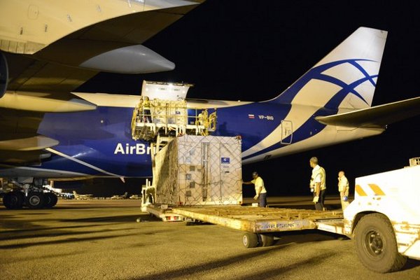A következő két megépített Galileo műhold egy Boeing-747-es teherszállító gép gyomrában repülte át az Atlanti-óceánt, a németországi Frankfurtból indulva és Cayenne-be, Francia Guyanába érkezve, május 7-én. (Kép: ESA / P. Müller)