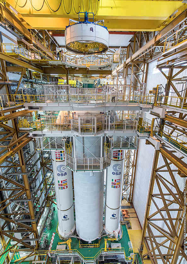 Az Ariane-5 hordozórakéta összeszerelése a francia guyanai űrközpontban. (Kép: ESA / CNES / Arianespace / Optique video du CSG / S. Martin)