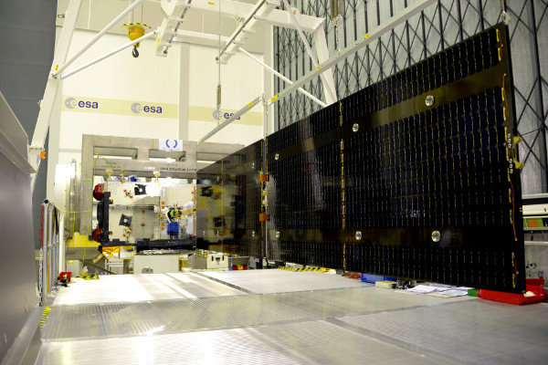 A két napelemszárny egyike kinyitva, még földi tesztelés közben. (Kép: ESA / P. Muller)