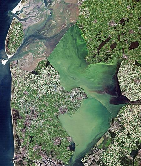 Egy amerikai Landsat műholdkép 2010 szeptemberéből, amely Hollandia partjainál a Watt-tenger egy részletét (balra fent) és az IJssel-tavat (középen, zöldes színárnyalattal) mutatja. A két vízfelületet egy feltűnő, hosszú egyenes zárógát (Afsluitdijk) választja el egymástól. (Kép: USGS / ESA)