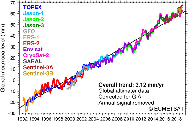 A tengerek vízszintjének emelkedése 1992 és 2019 között, különböző műholdak mérései alapján. A vízszint átlagos éves emelkedése 3,12 mm. (Kép: Eumetsat)