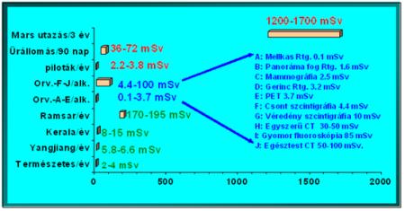 A kozmikus sugárzás által leadott dózis nagyságrendjét a 6. ábra szemlélteti. A földi, természetes eredetű sugárzások egy átlagemberbe többnyire évente 2-4 mSv dózist szállítanak, de vannak kivételesen nagy háttérsugárzású területek is a Földön. Ilyen például az iráni Ramsar tartomány a Kaszpi-tenger déli partvidékén. Az orvosi diagnosztikai eljárások azonban sokkal nagyobb dózisokat eredményezhetnek. Egyszeri, egész testet érintő CT vizsgálat akár 100 mSv dózisterhelést is okozhat. A sugárveszélyes munkahelyeken a megengedhető éves dózisterhelést 5 év átlagában 20 mSv-ben szabályozták. Az űrhajósok az ISS-en azonban már 3 hónap alatt is ennek többszörösét szenvedhetik el. Jelenlegi ismereteink szerint egy 3 évig tartó Mars-utazás dózisa már komoly jövőbeli kihatásokkal járhat, növelve a genetikai károsodás és rák kialakulás veszélyét. Ezért igen fontos tisztában lenni a kozmikus sugárzás tényleges kockázatával. A Columbus modulon jelenleg folyó, DOSIS fedőnevű, vizsgálatok is erre irányulnak.