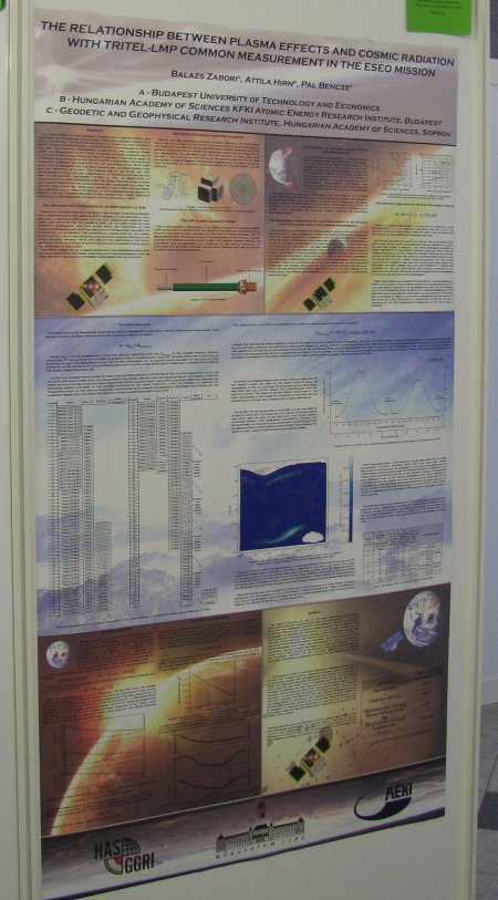 A kutatás során körvonalazódott a rendkívüli lehetőség, ami az általunk épített két különböző műszer egyidejű méréseiben rejlik. Az LMP segítségével regisztrálhatjuk az elektronsűrűség változásait az ionoszféra úgynevezett F2-rétegében. Ezt összehasonlítva a TriTel méréseivel, következtetéseket vonhatunk le elsőként az F2-rétegben az elektromágneses sugárzás és a részecskesugárzás által előidézett ionizáció viszonyáról, valamint a rekombináció és a diffúzió nagyságáról. Az erre kidolgozott tudományos koncepciót mutattuk be a COSPAR konferencián egy poszter prezentáció formájában, mely nem várt sikert és új ismeretségeket hozott a számunkra. Egy cseh kutatócsoport érdeklődött a méréseink után, mivel az általuk fejlesztett új légköri modellhez kitűnő adatokat tudnánk szolgáltatni. Sikerült szoros együttműködést kiépítenünk a japán Tohoku Egyetemen folyó, hasonlóan plazmamérésre alkalmas műszer fejlesztőivel, akikkel ezentúl szorosabb együttműködést remélünk. Feltétlen meg kell említenünk a rejtélyes, fiatal kutatót Brazíliából, akit ugyan nagyon izgatott a munkánk, és elkérte az elérhetőségeinket, azonban az angoltudása annyira hiányos volt, hogy tulajdonképpen elbeszéltünk egymás mellett.