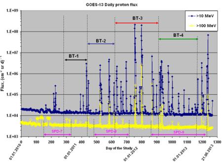 A BioTrack program négy, egymáshoz csatlakozó részből állt (BT-1 – BT-4). A napkitörésekből származó, 10 MeV és 100 MeV energiáknál nagyobb energiájú protonok számának változása a vizsgálatok 917 napja alatt a GOES-13 műhold mérései alapján. Az ábra alján három SPD vizsgálat időtartama szerepel. Ezek részben átfedik a BioTrack vizsgálatok idejét.