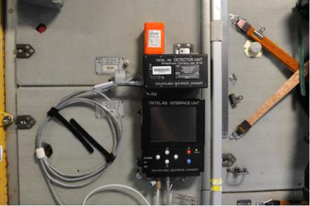 A TriTel-RS mérési öszzeállítás a Zvezda modulban. A piros nomex anyagból készült tok tartalmazza a termolumineszcens és szilárdtest nyomdetektorokból álló, a kozmikus sugárzás irányfüggését vizsgáló, passzív detektorrendszert, mely az aktív szilícium félvezető alapú 3D-s részecskedetektáló teleszkópokkal azonos orientáltságú (felső fekete doboz). Az alsó doboz az aktív mérőrendszer mérési adatait automatikus feldolgozás után saját kijelzőjén megtekinthetővé teszi.