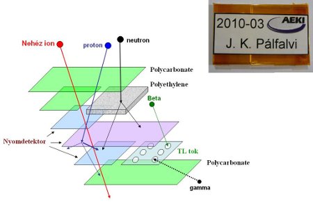 1. ábra: A passzív detektor csomag (stack) két fő alkotóelemből áll: a termolumineszcens detektotok (TLD) – ezek a TL tokban helyezkednek el – és a nyomdetektorok (3 polikristályos műanyag lapka). Ezeket kiegészíti egy polietilén lap és 3 polikarbonát védőfólia (itt zölddel jelölve). Összecsomagolt állapotban a stack 4,5 × 6 cm2 területű, 5 mm vastag és 18 g tömegű (ld. a jobb felső sarokban). Ez az összetétel és a speciális kiértékelő technika lehetővé teszi a kozmikus sugárzás szinte minden komponensének vizsgálatát, mérését, ahogy az ábrán is jelölve van.