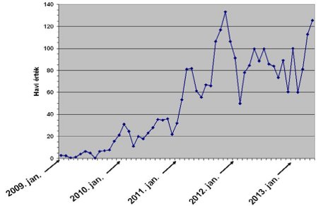 2. ábra: A megfigyelt napfoltok havi számának változása a 24. napciklus felszálló ágában. A ciklus hivatalos kezdete 2008. január volt. Azonban abban az évben a naptevékenység végig minimális volt, egészen 2009. augusztusig.