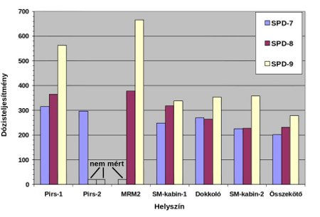 A szerviz (SM), Pirsz és MRM2 modulokban a dózisteljesítmény változását a lenti grafikon jeleníti meg. A dózisteljesítményt μGy/nap egységben adjuk meg. Jól látható, hogy az SPD-9 ideje alatt a dózisteljesítmény minden egyes mérési ponton jelentősen megnövekedett. Ez azonban nem a napfoltok számában bekövetkezett kis változás miatt alakult így, hanem az űrállomás magasabb pályára kerülése miatt (ld. előző cikkünket). Az egyes mérési pontok közötti eltérés az adott hely eltérő sugárvédelmi viszonyaira utal.