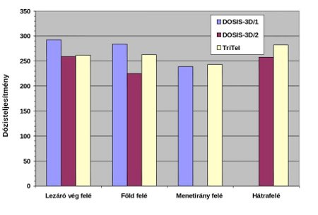 A DOSIS-3D vizsgálatokban kapott, 11 pontban mért adatok bemutatása hosszadalmas lenne, ezért kiválasztottuk azt a pozíciót, ahol a TriTel projekt detektorai is elhelyezkedtek és három irányból vizsgálták az alacsony LET-ű sugárzások dózisait. Az összehasonlító eredményeket a 7. ábrán mutatjuk be.