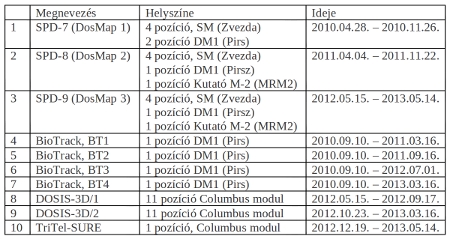 1. táblázat: A vizsgálatok helye és ideje. A használt rövidítések: SM - szerviz modul, DM1 - első dokkolómodul, M-2 második kutatómodul.