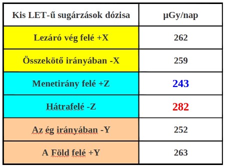 2. táblázat: A kis LET-ű sugárzások irányfüggése. A dózisteljesítmény a menetirányból nézve a legkisebb, a hátoldalról pedig a legnagyobb. Ennek oka a Föld mágneses tere által eltérített protonok nyugat-keleti mozgásiránya. A jelenség már korábban is ismert volt, de ilyen kisméretű, passzív TLD detektrokkal ebben a vizsgálatban sikerült ezt először meggyőzően kimutatni.