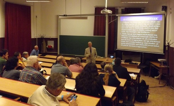 Dr. Szabó József (nyugállományú repülő tábornok, egyetemi tanár) az űrdinamika alapjairól és annak egyetemi oktatásáról beszélt. Kiemelte azokat a rossz szokásokat, kifejezéseket, amik elterjedtek Magyarországon, nem csak a közbeszédben, hanem a sajtóban is. Ilyen a „kilövés” is, amely Verne idejében még elfogadható volt. De ma már a belső ballisztikával foglalkozó szakemberek tudják, hogy az ágyúból 2000 m/s sebességgel távozik az ágyúgolyó, és gyorsulása 51 000 g lesz. Ezt bizony nem csak űrhajósok, de a műszerek se bírnák ki, ezért pontosabb indításról, esetleg startról beszélni.