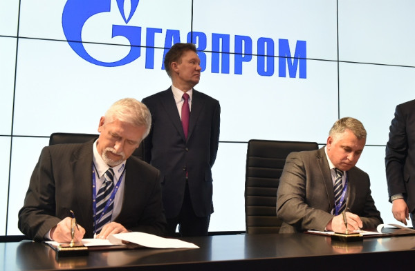 A Gazprom vállalat standján Solymosi János, a BHE űrtechnológiai igazgatója (balra) és Dmitrij Szevasztyjanov, a Gazprom Space Systems vezérigazgatója aláírják az együttműködési szerződést. A háttérben Alekszej Miller, a Gazprom vezérigazgatója. (Fotó: Gazprom Space Systems)