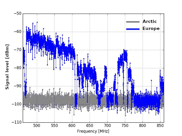 3. ábra: Mérési eredmények Európa (kék) és az Antarktisz felett (szürke). (Kép: BME) [A grafikonon az Arctic felirat hibás, az Antarktiszról van szó. – A szerk.]