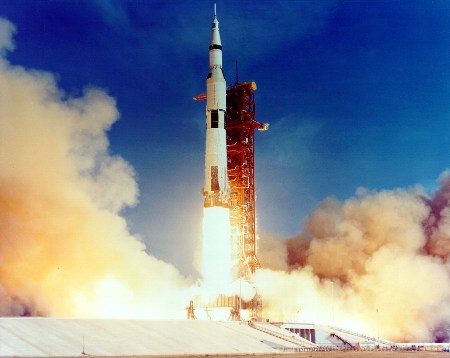 Vad robaj dübörög a Kennedy Űrközpont 39A indítóállása felett, hatalmas felhő gomolyog szét rohanvást, a rakétával az epicentrumában. Egy pillanatra teljesen el is takarja a 121 méter magas óriást, de hamar oszlik, ahogy a hajtóművek oldalra fújják. A visszaszámlálás elérte a nullát. A rakéta pedig alig láthatóan megmozdul. Most robbantak le a Saturn V-öt az indítóállvány platformjához rögzítő elemek, a rakéta szabad, és a 3500 tonnás tolóerőnek engedelmeskedve el is indul.