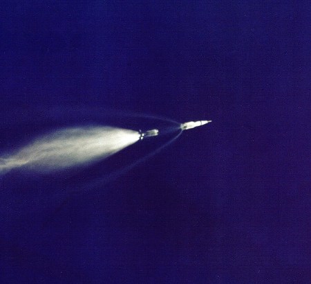 Egy kis villanást látunk az egészen elhalványuló fénypontnál. Kiürült az első fokozat és most vált fokozatot a rakéta. Lerobbantották az S-IC-t és beindult az S-II hajtóműve. És ezzel el is tűnt a szemünk elől a 68 kilométer magasan haladó rakéta. Felszálltunk! Megvolt a felszállás!