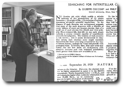Giuseppe Cocconi és Philip Morrison cikke 1959. szeptember 19-én látott napvilágot a Nature-ben Searching for Interstellar Communication címmel. Többek között arról volt benne szó, hogy „saját környező világunk példájából kell kiindulnunk”, továbbá, hogy más civilizációk „az emberi történelemhez képest jóval hosszabb, akár geológiai korokhoz mérhető időtartamon keresztül is fennmaradhatnak. Amiből viszont az következik, hogy a mi Napunkhoz hasonló csillagok közelében létezhetnek olyan civilizációk, melyek tudományos ismeretei, illetve technikai lehetőségei messze felülmúlják a mieinket.”