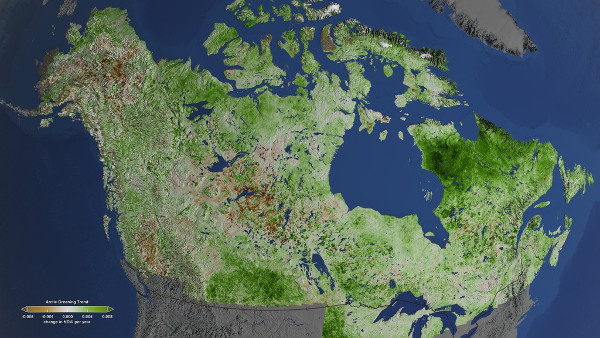 A sarkvidék kizöldülése: Kanada és Alaszka vegetációs indexének változása 1984 és 2012 között. A zöld területeken nőtt, a barnákon csökkent a vegetáció. A szembeötlő változás a felmelegedésnek tulajdonítható. (Kép: NASA / GSFC / Scientific Visualization Studio / Cindy Starr)