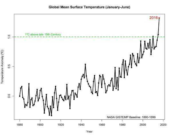 Az első félévi átlaghőmérséklet alakulása 1880 és 2016 között. A viszonyítási alapot az 1880–1899 évek átlaga jelenti, a zöld szaggatott vonal az ehhez képest mért 1 °C-os emelkedésnek felel meg. A 2016. év kiugróan magas értékét a szokottnál erősebb El Niño jelenségnek tulajdonítják. (Kép: NASA GISS)