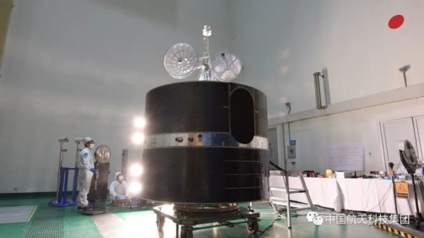 A legalább négy éves élettartamra tervezett, 1380 kg tömegű, forgásstabilizált Fengjün-2H kínai időjárási műhold, még a szerelőcsarnokban. (Kép: CASC)